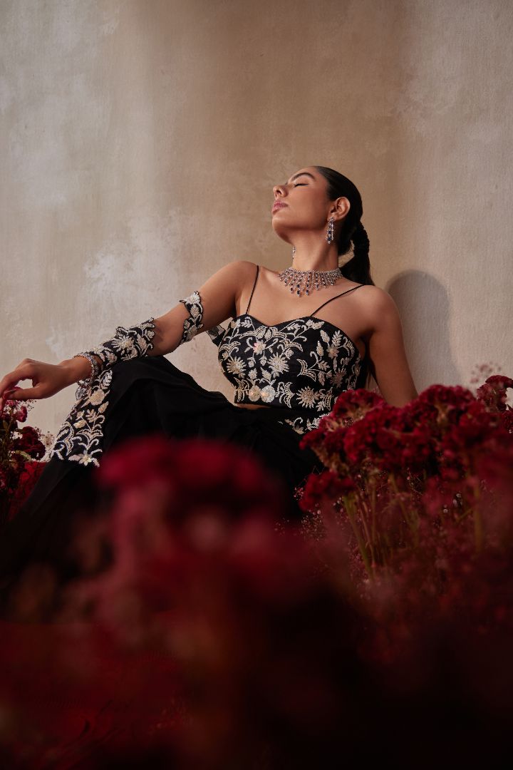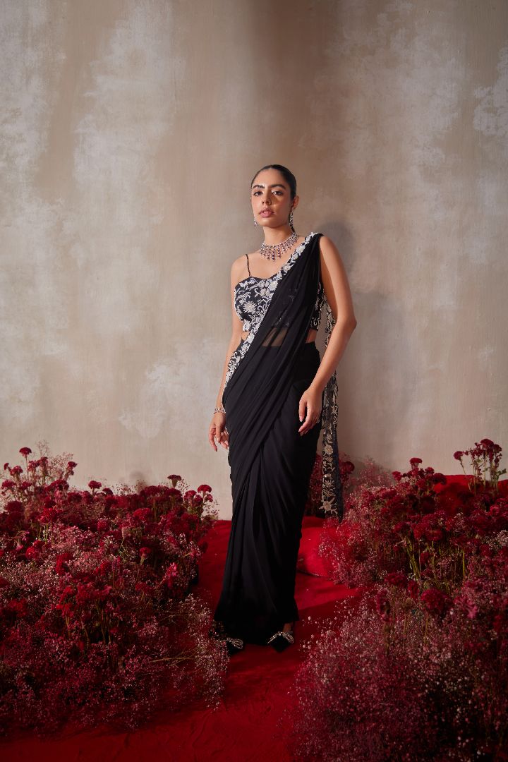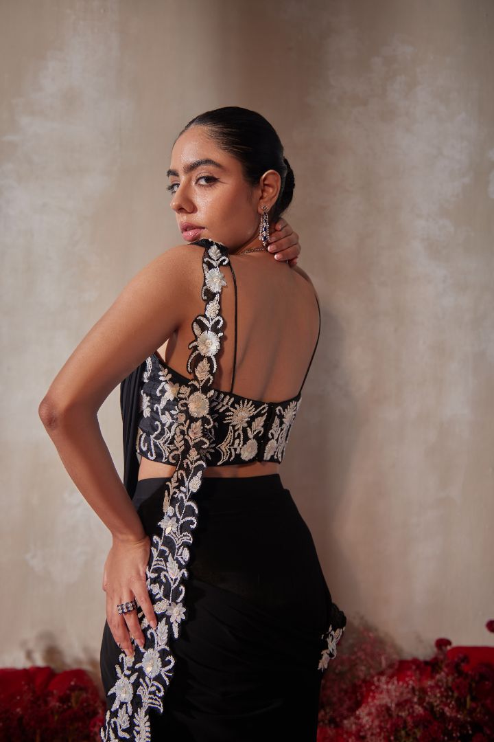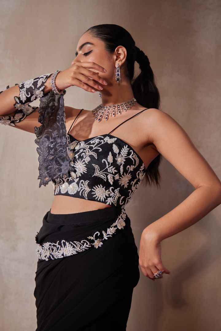 Dazzle in elegance with our Elnaz saree featuring an embroidered palla, hand embroidered blouse, delicately embellished with white pearls, katdana, leaf.